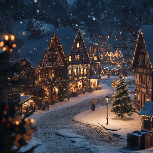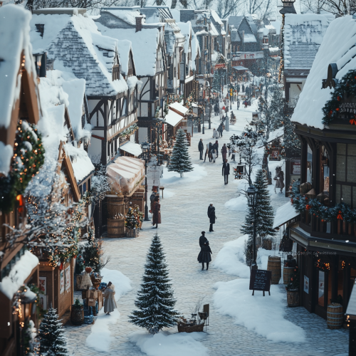 Medium Shot, front view, hyper realistic, winter, afternoon, sunny, European country style, snowy town with Christmas trees, decorations, large squares, festivals, lots of people on the streets, fairytale atmosphere, Canon EOS R5 with a 200mm lens, --style raw --v 6.1 --ar 1:1