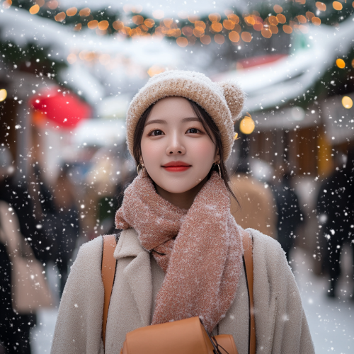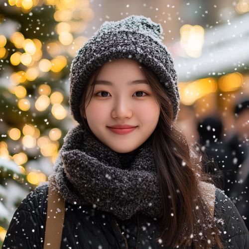 Close-Up shot, front view, hyper realistic, winter, afternoon, snowy, korean Solo, European country style, snowy town with Christmas tree, decorations, wide square, festival, lots of people on the street, beautiful fairy tale atmosphere, brightly smiling Korean woman., Canon EOS R5 with a 200mm lens, --style raw --v 6.1 --ar 1:1