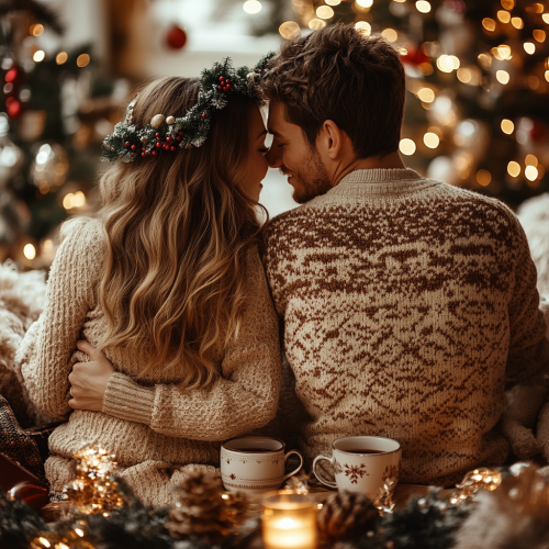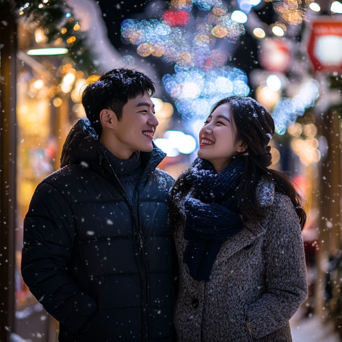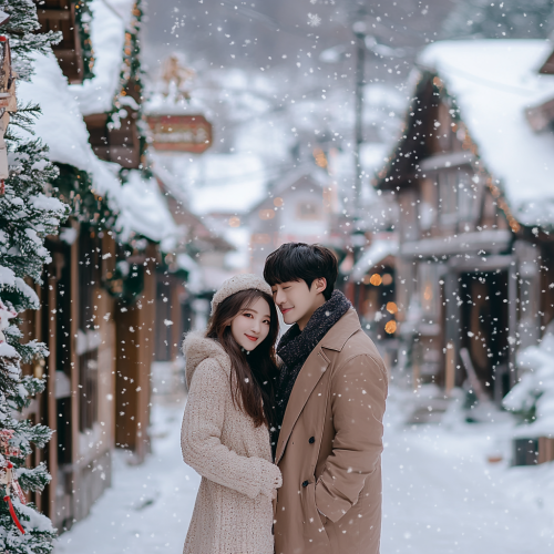 Upper body shot, Portrait, front view, hyper realistic, winter, afternoon, snowy, korean Couple, European country style, fairytale atmosphere, lovely, snowy village with Christmas trees, decorations, large squares, festivals, Canon EOS R5 with a 200mm lens, --style raw --v 6.1 --ar 1:1