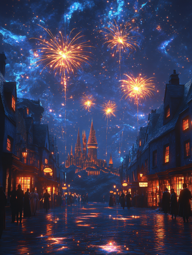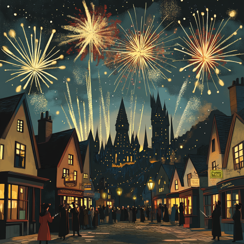 Clean paper-cut-out design in a fantasy style. gold foil accents, minimal color palette of deep-rich colors, and metallic gold, intricate linework, symmetrical and balanced composition, inspired by a magical scene of 4th of July fireworks display over Hogsmeade village, with vibrant enchanted fireworks lighting up the night sky in reds, whites, and blues, casting colorful reflections on cobblestone streets and quaint wizarding shops, Hogwarts castle faintly visible in the background under the starlit sky, wizards and witches gathered in awe, some waving small sparklers, warm glow from shop windows, festive and whimsical atmosphere, fantasy art style, rich colors
