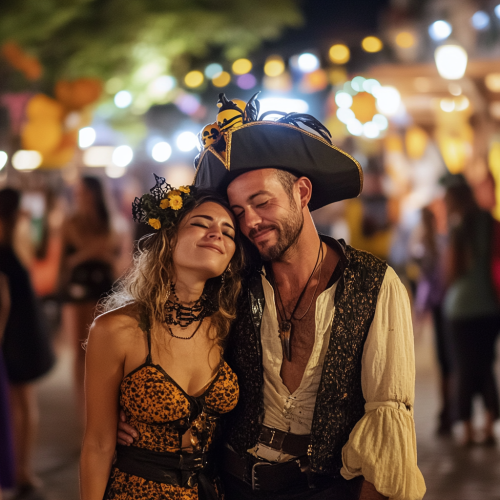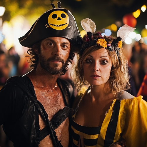 Create a couple in simple makeshift Halloween costumes of a pirate and a bee, stumbling down a street completely wasted after a night of partying and drinking. They look very tired out. Surround them with a diverse crowd of people in various Halloween outfits, vibrant decorations, and festive lights, capturing the chaotic and joyful atmosphere of Halloween night. --style raw
