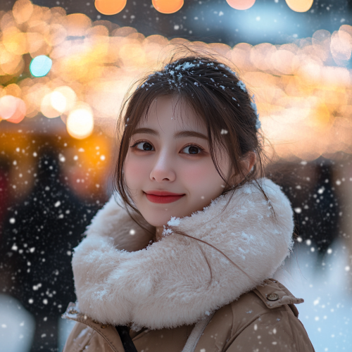 Close-Up shot, front view, hyper realistic, winter, afternoon, snowy, korean Solo, European country style, snowy town with Christmas tree, decorations, wide square, festival, lots of people on the street, beautiful and fairytale atmosphere, brightly smiling western white woman, Canon EOS R5 with a 200mm lens, --style raw --v 6.1 --ar 1:1