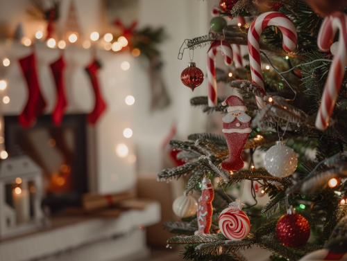 The image features a beautifully decorated Christmas tree in a cozy Polish living room. The tree is adorned with traditional candy canes and lollipop decorations hanging from its branches. The background includes a warm glow from a fireplace, with visible stockings hanging, and subtle decorations like fairy lights and baubles. There is also a soft blanket of artificial snow around the base of the tree, enhancing the festive ambiance --ar 4:3 --s 50 --v 6.0
