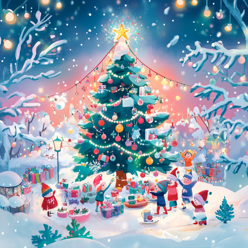 Design a vibrant, whimsical Christmas celebration scene filled with joy and imagination. Include a colorful Christmas tree decorated with unique ornaments, like tiny stars, snowflakes, and magical objects. Capture a festive gathering with characters (such as elves, animals, or even abstract creatures) joyfully exchanging gifts, sipping hot cocoa, and playing in the snow. Surround the scene with glowing string lights, falling snow, and a sky transitioning from soft blue to pink and purple. The overall illustration should be magical, playful, and full of Christmas spirit, with creative elements that evoke warmth and wonder