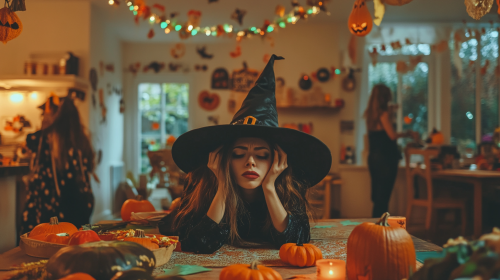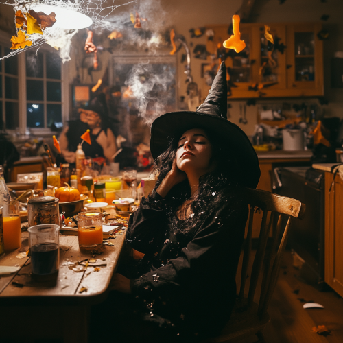 A realistic photograph of a woman in a simple funny witch halloween costume with simple make up tired out on a kitchen table inside a house, surrounded by a lively Halloween celebration with a few people around her. Colorful decorations, people in various costumes dancing, and dim lighting create a festive atmosphere in the middle of the night. The woman looks exhausted, with remnants of a fun night around him --style raw --ar 16:9