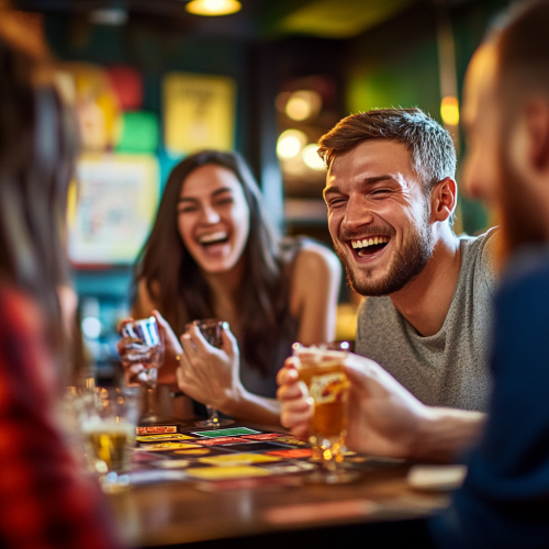 Create a festive social gathering with joyful Caucasian individuals engaged in a lively trivia game, showcasing laughter, drinks, and prizes, set in a cozy pub ambiance with vivid and inviting color tones. --fast