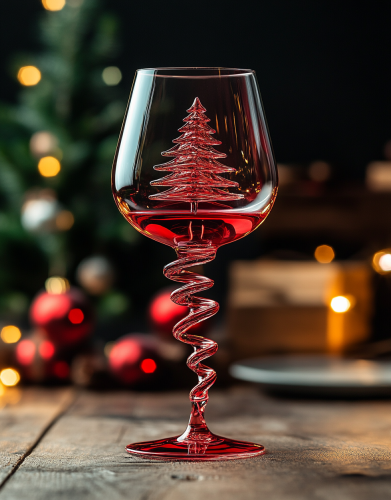 a glass with red wine with the stem of the glass in the shape of a Christmas tree, Christmas background with Christmas tree and lights, light background --ar 45:58