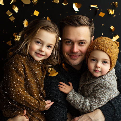 Visually appealing and festive photos of families with a mom, dad, and two young children in festive outfits on a black background with gold paper garlands in a Christmas theme --v 6.1