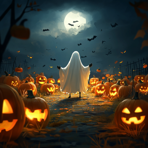 2D, halloween atmosphere The foreground and surroundings are filled with orange jack-o'-lanterns of all sizes. A big sheet ghost in the middle raised his hands and occupies 1/2 of the screen, The background is dark There is moonlight and bats and occupies 1/6 of the screen