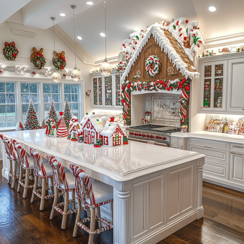 beautiful, modern white kitchen with stunning over the top gingerbread house Christmas decoration on the kitchen island. Some red, white, green, but mostly gingerbread and candy. Also, Small candy looking trees on the island as well.