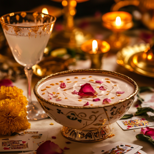 bright and fresh image of rose petal shrikhand bowl on table with playing cards and marigold flower and diyas as props and there ia also a gin and tonic cocktail in a seperate goblet glass on the table in a brightly lit image