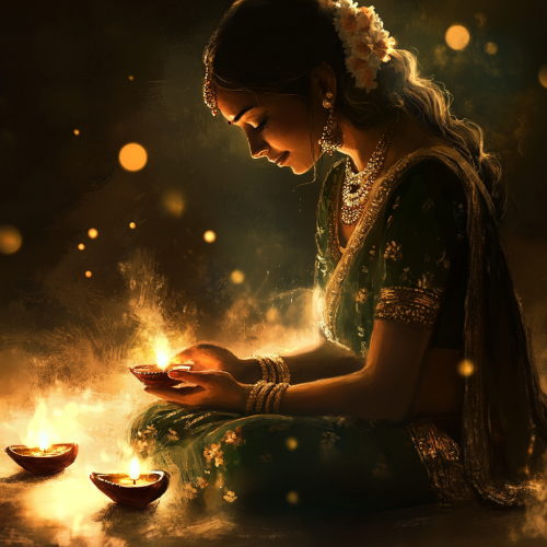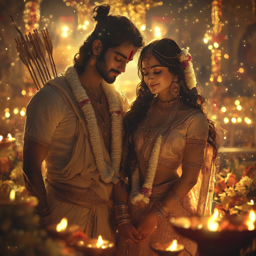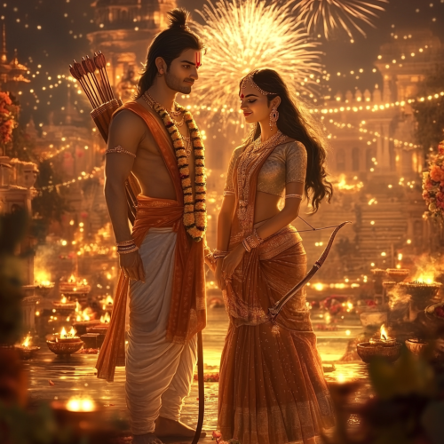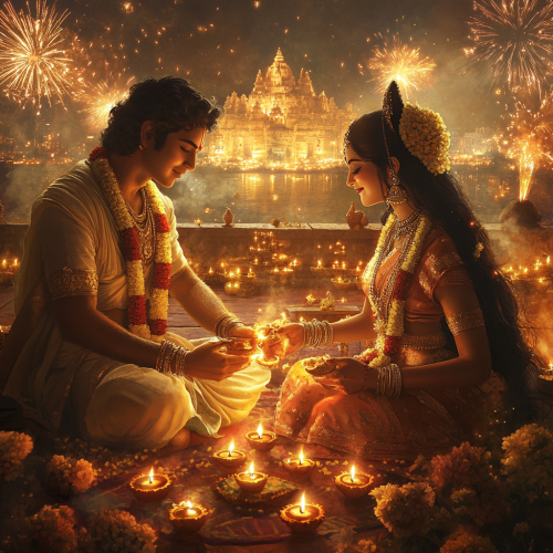 A divine scene of Lord Ram and Maa Sita celebrating Diwali in a traditional Indian setting, surrounded by a warm, glowing light from countless diyas (oil lamps) arranged around them. Lord Ram, dressed in royal attire with a gentle, noble expression, and Maa Sita, adorned in traditional, graceful clothing with a serene smile, are lighting diyas together. The background is filled with a soft, golden glow and fireworks in the night sky, adding to the festive spirit. Rangoli designs and floral decorations enhance the beauty of the scene, evoking the peace, joy, and light of Diwali.