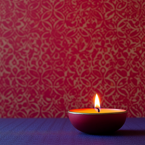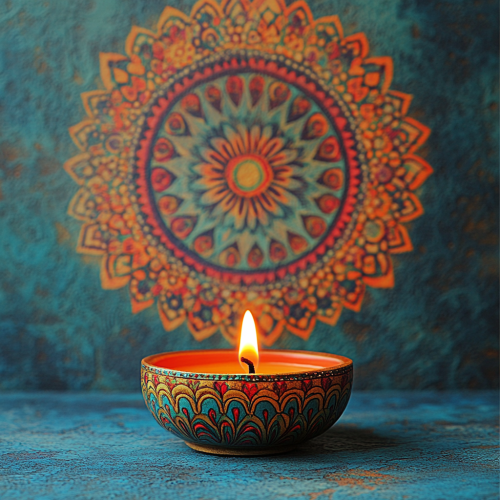 a diwali image with candle sitting at the bottom of the frame, with plenty of space above for text. On mandala background with diwali patterning --v 6.1 --s 250