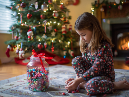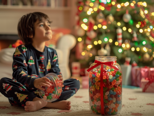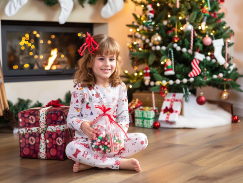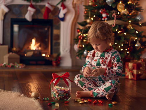 A child in cozy winter pajamas sits on the floor next to a beautifully decorated Christmas tree decorated with traditional Polish decorations such as glass baubles and straw stars. A happy 7-year-old child unwraps a gift - a transparent small jar filled with colorful jelly beans in the shape of Christmas trees and candy canes. The jar is decorated with a red ribbon. The room is filled with warm, delicate lighting, and Christmas decorations, including garlands and fairy tales, enhance the festive atmosphere. There is a fireplace burning in the background, which adds a cozy and warm character to the scene --ar 4:3 --s 50 --v 6.0