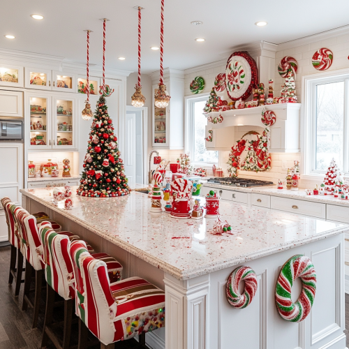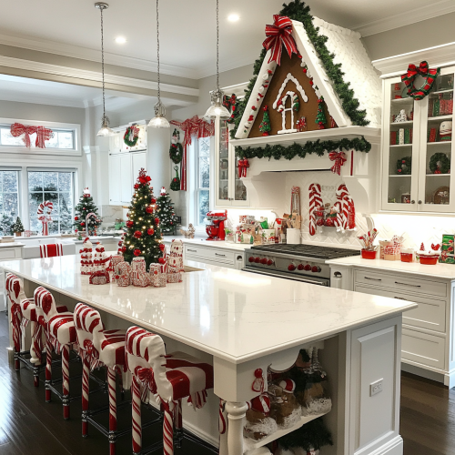 **beautiful, modern white kitchen with stunning gingerbread Christmas decoration on the kitchen island. lots of red, white, green, and gingerbread and candy. Also, Small candy looking trees on the island as well.