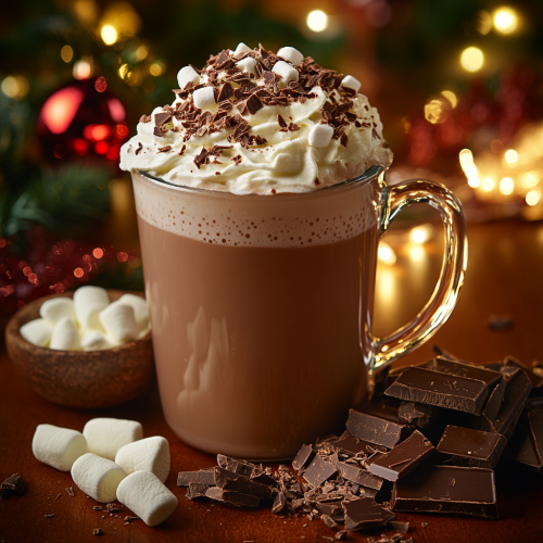 A festive close-up of a large mug filled with rich, creamy hot chocolate topped with whipped cream and chocolate shavings, in a cozy Christmas setting. The mug is surrounded by holiday decorations, with a soft-focus background featuring warm Christmas lights. Ingredients like whole milk, sweetened condensed milk, chocolate chunks, and marshmallows are arranged attractively next to the mug, adding a homemade, comforting vibe. The lighting is warm and inviting, capturing the holiday spirit and warmth