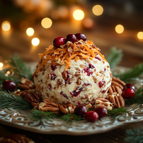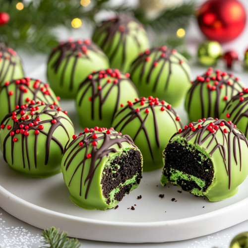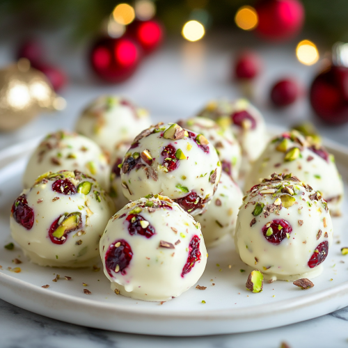 A close-up shot of white chocolate cranberry pistachio truffles, elegantly arranged on a white plate. The truffles are beautifully crafted, with creamy white chocolate coating studded with vibrant red cranberries and green pistachio pieces. The background includes blurred seasonal decorations, hinting at a holiday atmosphere, adding a cozy and festive touch. The scene is set on a marble countertop, and the lighting is soft, enhancing the luxurious and delightful texture of the truffles, perfect for a holiday dessert or festive treat.