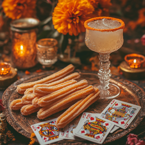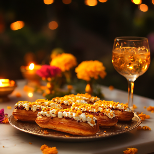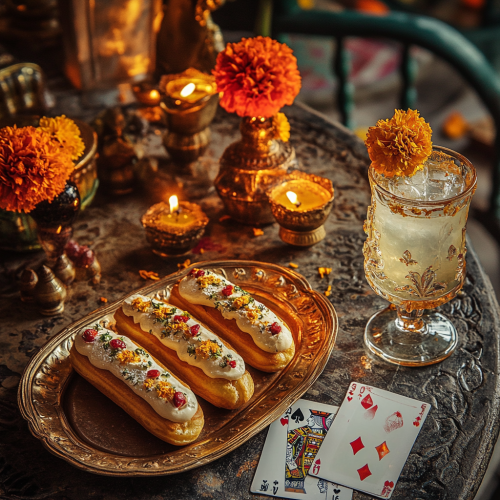 bright and fresh image of dryfruit eclairs on table with playing cards and marigold flower and diyas as props and there ia also a gin and tonic cocktail in a seperate goblet glass on the table in a brightly lit image
