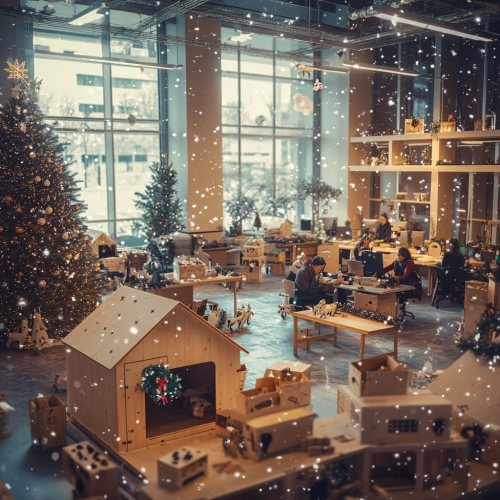 Create a magical, whimsical scene inside Santa's workshop, set in a beachside town. The workshop should be filled with vibrant colors, playful details, and festive decorations like candy canes, toy-making stations, elves working happily, and twinkling lights. In the background, add a touch of the beach, with palm trees visible through frosted windows. The overall vibe should be cheerful and cozy, with a coastal twist to reflect the outlet mall’s location near the ocean --ar 3:2