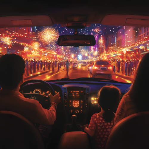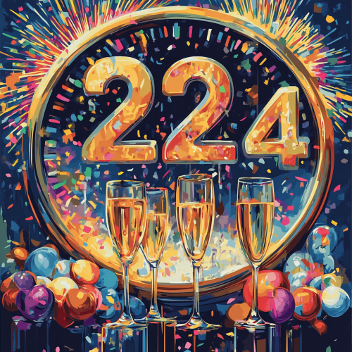 Create a dynamic and festive New Year celebration scene filled with bright colors, fireworks, and confetti. The focus should be on the countdown to midnight, with large, glowing numbers '2024' prominently displayed. Include elements like champagne glasses clinking, party hats, and a stylish clock striking midnight. The background should have a burst of vibrant fireworks in the night sky, with a shimmering gradient transitioning from dark blue to gold. Incorporate festive decorations like streamers, balloons, and abstract shapes to give a modern, energetic feel. The overall composition should feel joyful, exciting, and ready for a fresh new beginning.