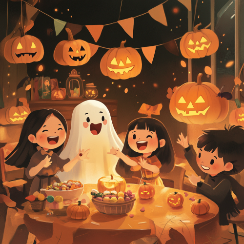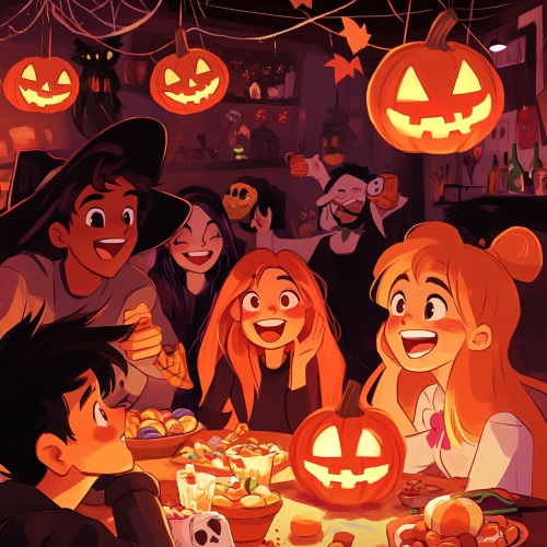 Illustration of a lively Halloween party in a webtoon style, featuring 4-5 joyful characters in playful costumes like witches, ghosts, and monsters. They are gathered in a decorated indoor setting with jack-o’-lanterns, hanging cobwebs, and streamers. The characters show exaggerated expressions of joy and excitement, typical of webtoons. Warm, glowing lights illuminate the scene, enhancing the festive Halloween atmosphere. Candy bowls, Halloween snacks, and autumn leaves add extra charm.