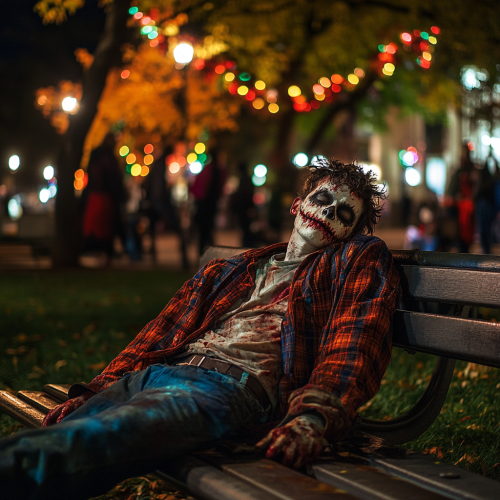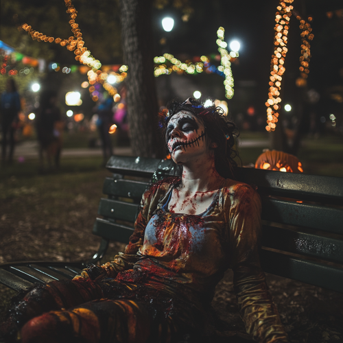 A realistic photograph of a woman in a simple funny witch halloween costume with simple make up tired out on a bench in the park, surrounded by a lively Halloween celebreation with a few around him. Colorful decorations, people in various costumes, and dim lighting create a festive atmosphere in the middle of the night. The woman looks exhausted, with remnants of a fun night around him --style raw