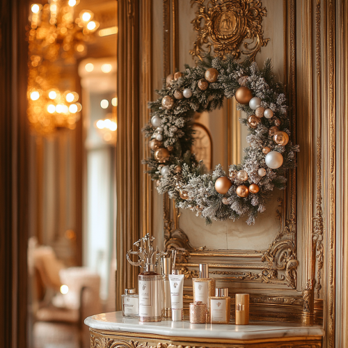 cardboard wreath handing on ornate door, beautiful gold room with mirrors , warm light, festive, side table with beauty products --style raw --v 6.1 --s 250