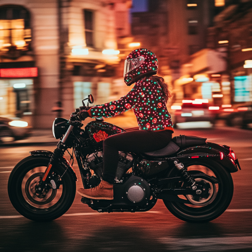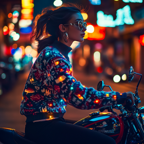 Full side view of a stylish person riding a motorcycle, wearing an eye-catching, quirky Christmas ugly sweater adorned with small, twinkling lights, without a helmet. The sweater has a fun, festive pattern, and the person exudes a cool, laid-back vibe. The entire motorcycle is visible, showcasing its sleek design against a lively city street backdrop, slightly blurred to emphasize the rider. The glowing lights on the sweater create a warm, festive atmosphere, contrasting with the urban night setting filled with subtle holiday decorations