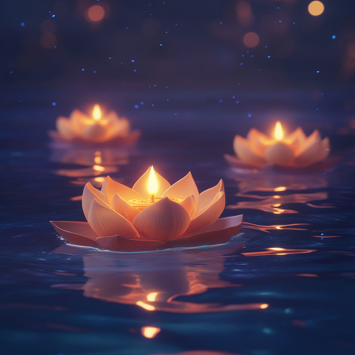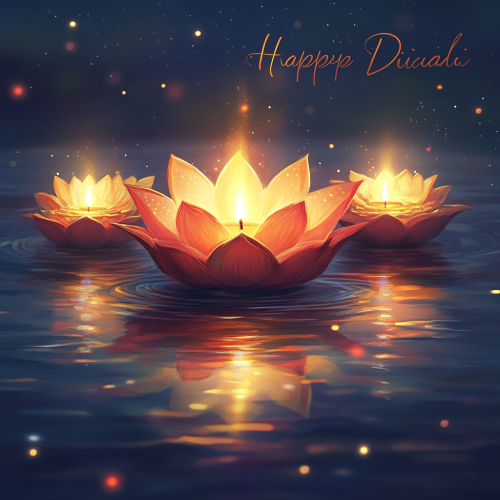 A high-quality, vibrant banner featuring three glowing lotus-shaped diyas floating on calm water at night. The diyas emit a warm and radiant glow, with soft reflections shimmering on the water surface. The background showcases a serene, starlit night sky, creating a peaceful yet festive atmosphere. The text is written 'Happy Diwali' is elegantly integrated into the scene, complementing the celebration. The image is highly detailed, focusing on beauty, tranquility, and celebration in a harmonious way