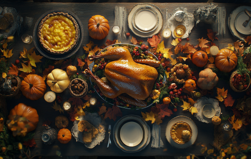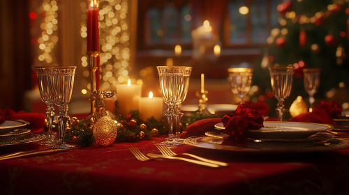 A beautifully set table with a red tablecloth and golden cutlery, surrounded by twinkling candles. Add light reflections on crystal glasses and create a festive background with garlands and hanging decorations, enhancing the celebratory vibe. --ar 16:9