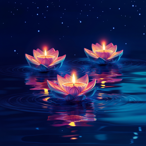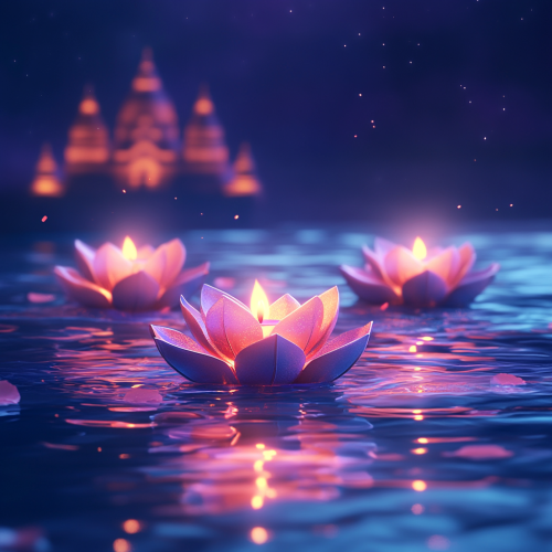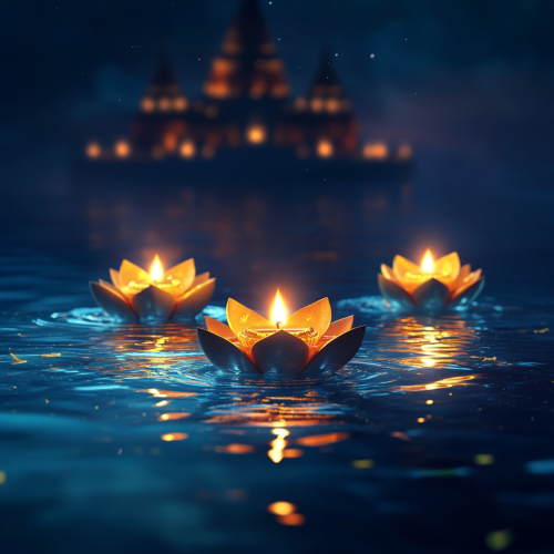 A high-quality, vibrant banner featuring three glowing lotus-shaped diyas floating on calm water at night. dark blue neon background The diyas emit a warm and radiant glow, with soft reflections shimmering on the water surface. The background showcases a serene, starlit night sky, creating a peaceful yet festive atmosphere. The text is written 'Happy Diwali' is elegantly integrated into the scene, complementing the celebration.temple in the background, The image is highly detailed, focusing on beauty, tranquility, and celebration in a harmonious way