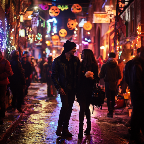 Create a dynamic scene of a couple in simple Halloween costumes, stumbling down a lively street after a night of partying. Surround them with a diverse crowd of revelers in various Halloween outfits, vibrant decorations, and festive lights, capturing the chaotic and joyful atmosphere of Halloween night. --style raw