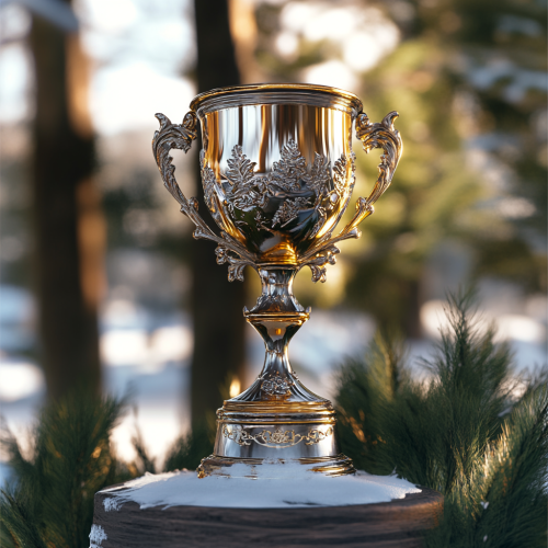 Close-Up shot, front view, hyper realistic, winter, morning, sunny, E-sports gaming competition trophies, podiums, festivals, Canon EOS R5 with a 200mm lens, --style raw --v 6.1 --ar 1:1