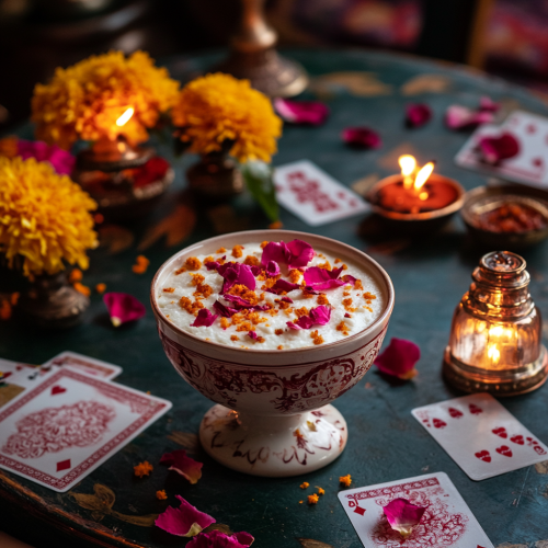 bright and fresh image of rose petal shrikhand on table with playing cards and marigold flower and diyas as props and there ia also a gin cocktail goblet glass on the table