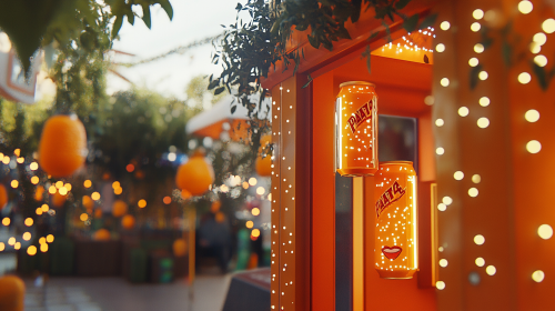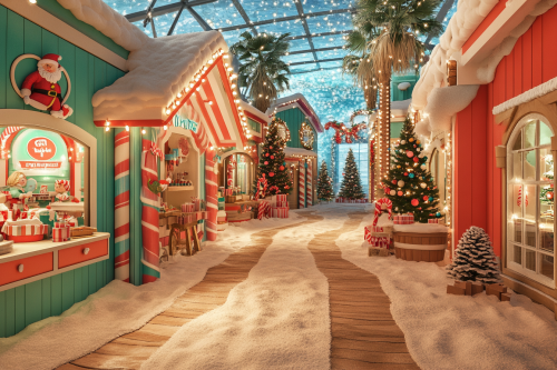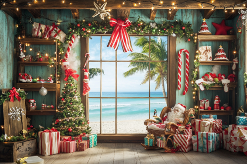 Design a whimsical Santa's workshop wall backdrop for a beachside town. The wall should feature playful festive details: wooden beams, twinkling string lights, large candy canes, and shelves filled with toys and wrapped presents. Include festive, hand-painted holiday decorations on the wall, like snowflakes and ornaments. Through the window, show a subtle view of palm trees and a sunny beach horizon to hint at the coastal location. The style should be cheerful and magical, with warm holiday colors, perfect for placing Santa's chair and tree in front of it --ar 3:2