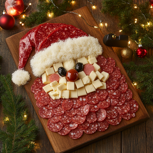 Create a festive charcuterie board arranged to resemble Santa Claus. Use slices of red salami to form Santa's hat, adding a layer of fluffy, white cheese or similar to simulate the hat’s trim. Create Santa’s face using cubes of various cheeses for the beard and face. Black olives serve as eyes, and a red cherry tomato or similar round item as the nose. Place the arrangement on a rustic wooden board, surrounded by holiday decorations like sprigs of evergreen and warm, glowing fairy lights, adding a cozy Christmas ambiance