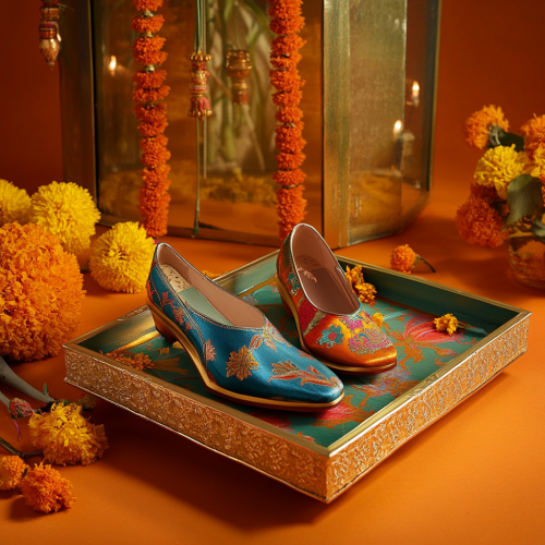 Design a vibrant, festive Bhai Dooj celebration with a modern twist, focusing on shoes as a symbol of the bond between brothers and sisters. Create an artistic scene where a sister is gifting a pair of stylish shoes to her brother as part of the tradition, set against a colorful and festive Indian backdrop with traditional elements like rangoli, diyas, and marigold flowers. The shoes should be central in the composition, placed on an elegant tray decorated with ethnic patterns, highlighting the gift exchange. Use a warm and celebratory color palette, blending tradition with contemporary style, and subtly incorporate the brand's logo or shoe designs in the overall composition to symbolize modernity and family love.
