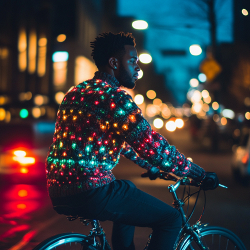Full side view of a stylish man riding a bicycle, wearing an eye-catching, quirky Christmas ugly sweater adorned with small, twinkling lights, without a helmet. The sweater has a fun, festive pattern, and the man exudes a cool, laid-back vibe. The entire bicycle is visible, with its design complementing his style, set against a lively city street backdrop, slightly blurred to focus on the rider. The glowing lights on the sweater add a warm, festive atmosphere, contrasting with the urban night setting and subtle holiday decorations