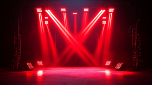 a music festival is being sponsored by a stage lighting company. Create an advertising image to portray this. red light beam, modern, minimalis, --ar 16:9