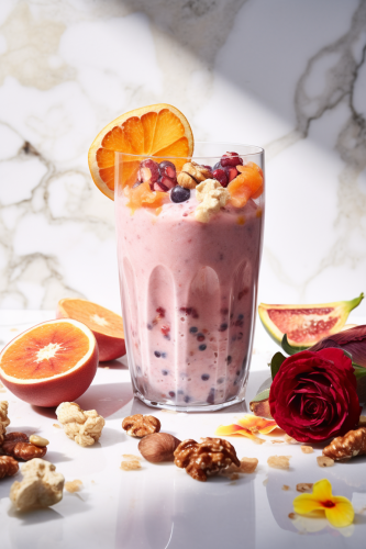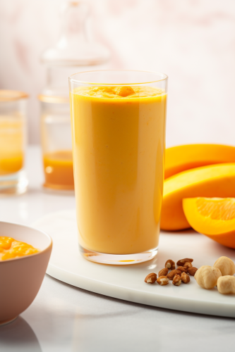 carrot orange smoothie, healthy, photography for a cook book, 30 degree shot, light background, marble tabletop, beautiful soft lighting, 80mm --no dark background, herbs, mint, straw --v 5.2 --ar 2:3