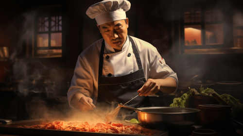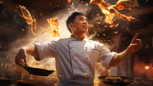 photorealistic illustration of a young chinese chef tossing food in a work with dramatic lighting --ar 16:9