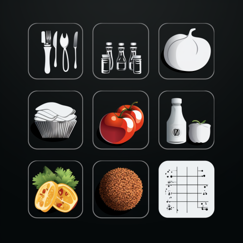 an image divided into four quadrants , each containing an icon i can use for my AI-powered cooking web site. I want the icons to be grayscale, and low on detail.
