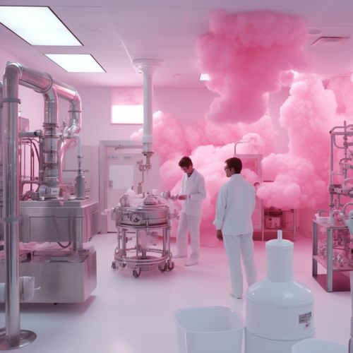 cotton candy contraption, scientists in a lab, tubes and chrome, all white room, bright pink cotton candy --v 5.0