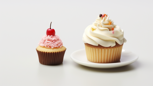 a small cupcake and a miniature cake shop on a single white plate, plain white background, photorealistic, detailed, hd, --ar 16:9 --v 5.2