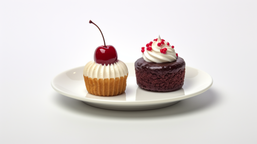 a small cupcake and a miniature cake world on a single white plate, plain white background, photorealistic, detailed, hd, --ar 16:9 --v 5.2