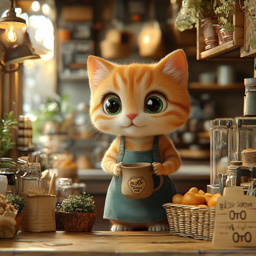 create A logo , name cute cat cafe, Cat wearing an apron, brewing coffee in a cozy coffee shop setting. 16:9, full body, 3D, Pixar style, cartoon --s 750