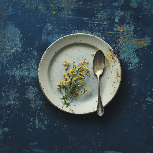 a very dirty plate, on which lie a spoon and a fork, next to the plate lies a sprig of mimosa, blue background, uniform, blue plain background, uniform blue background, minimalism, minimalistic image, realism, film effect