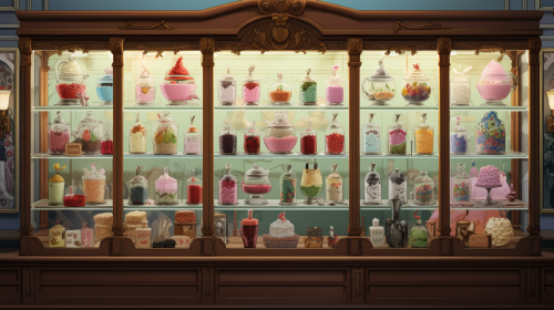 a fancy glass case filled with ice cream flavors, wes anderson style, studio ghibli style --ar 16:9