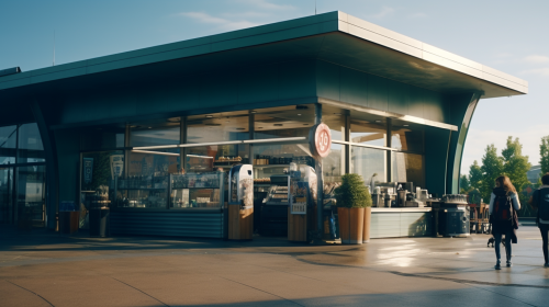 a small shopping island with a Starbucks style that sells crepes using farmhouse and navy blue as the brand colors located inside a bus station, with high quality cinematographic style photography in 4k with a canon camera with an iso 100 , f/10, --ar 16:9