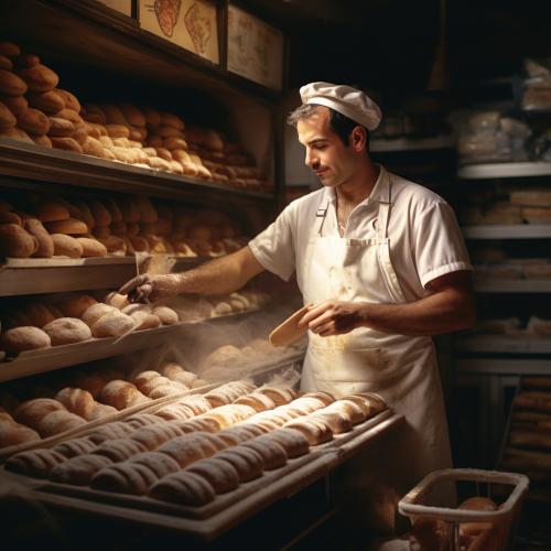 photography of a French baker at work, photorealistic, natural Light, Minolta Maxxum 7000, 85mm